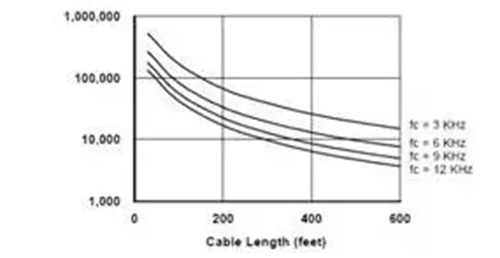 變頻器的載波頻率越高,輸出電流波形越接近正弦波,這會(huì)降低電機(jī)的運(yùn)行溫度,從而延長(zhǎng)絕緣的壽命。但是,更高的載波頻率意味著每秒鐘產(chǎn)生的尖峰電壓數(shù)量更多,對(duì)電機(jī)的沖擊的次數(shù)更多。圖4給出了絕緣壽命隨著電纜長(zhǎng)度與載波頻率的變化。從圖中可知,對(duì)于200英尺長(zhǎng)的電纜,當(dāng)載波頻率從3kHz提高到12kHz(變化4倍)時(shí),絕緣的壽命從大約8萬(wàn)小時(shí)降低到2萬(wàn)小時(shí)(相差4倍)。